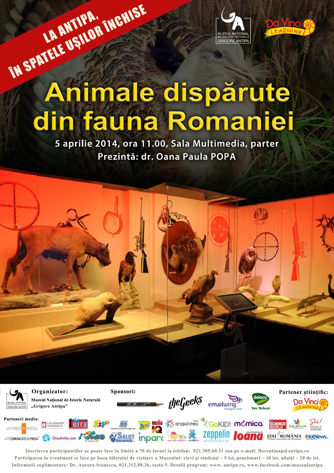 Conferinta “Animale disparute din fauna Romaniei” ne va oferi prilejul sa depanam, impreuna, „amintiri” legate de cateva dintre speciile de animale care au trait pe teritoriul tarii noastre.