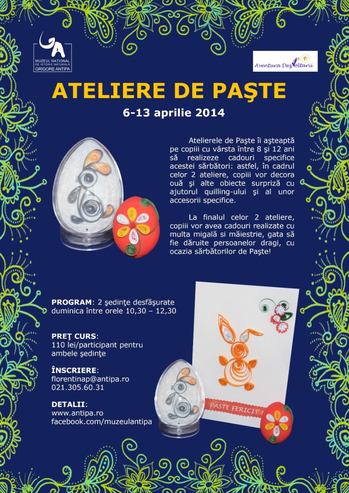 Muzeul National de Istorie Naturala “Grigore Antipa“ invita copiii cu varste intre 8 si 12 ani sa participe la Atelierele de Paste organizate in perioada 6 – 13 aprilie 2014. Cei mici vor invata sa foloseasca tehnica rasucirii hartiei pentru a realiza daruri pentru aceste sarbatori; vor decora oua si alte obiecte surpriza cu ajutorul quilling-ului si al unor accesorii specifice.