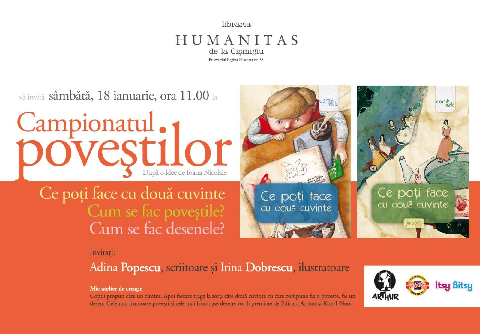 Nu este pentru prima daca cand Libraria Humanitas de la Cismigiu organizeaza Campionate ale Povestilor, cu invitati dintre cei mai interesanti, iar evenimentul este unul care atrage intotdeauna atentia, atat copiilor cat si parintilor, iar cei mici il asteapta intotdeauna cu bratele deschise si cu pofta de noi intalniri si intamplari specatculoase, caci ce copil nu adora povestile si ce copil nu se lasa purtat in lumea lor si a desenelor...?