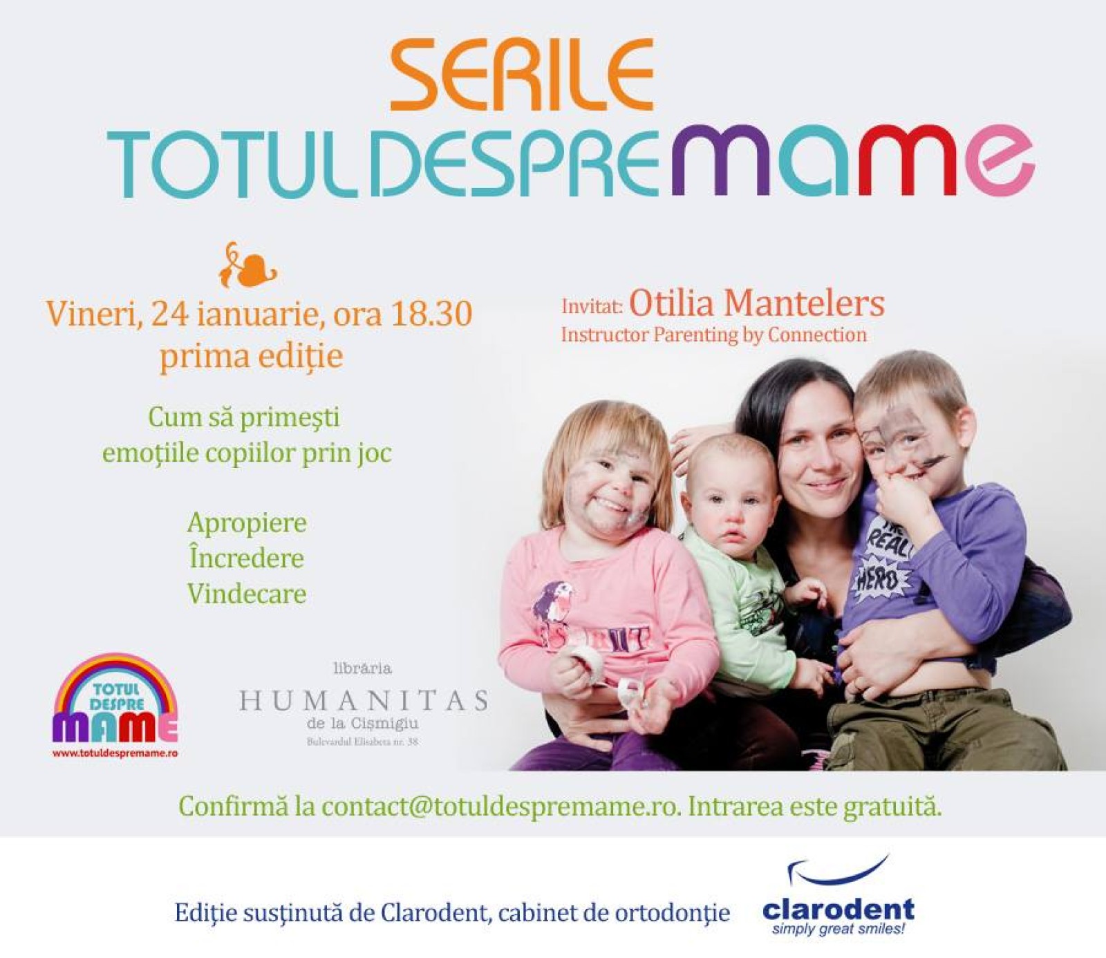 Ei bine, emotiile copiilor conteaza! Si vom afla asta de la Otilia Mantelers, instructor de parenting by connection, care pe data de 24 ianuarie, de la ora 18.00 va fi prezenta la Libraria Humanitas de la Cismigiu si va vorbi mamelor despre emotiile celor mici, cel mai indragit curs al sau. Cursul va avea loc in cadrul Serilor „Totul despre mame”. Intrarea este gratuita, iar mamicile care vin insotite de copii vor afla cu bucurie ca organizatorii pregatesc si un atelier dedicat prichindeilor.