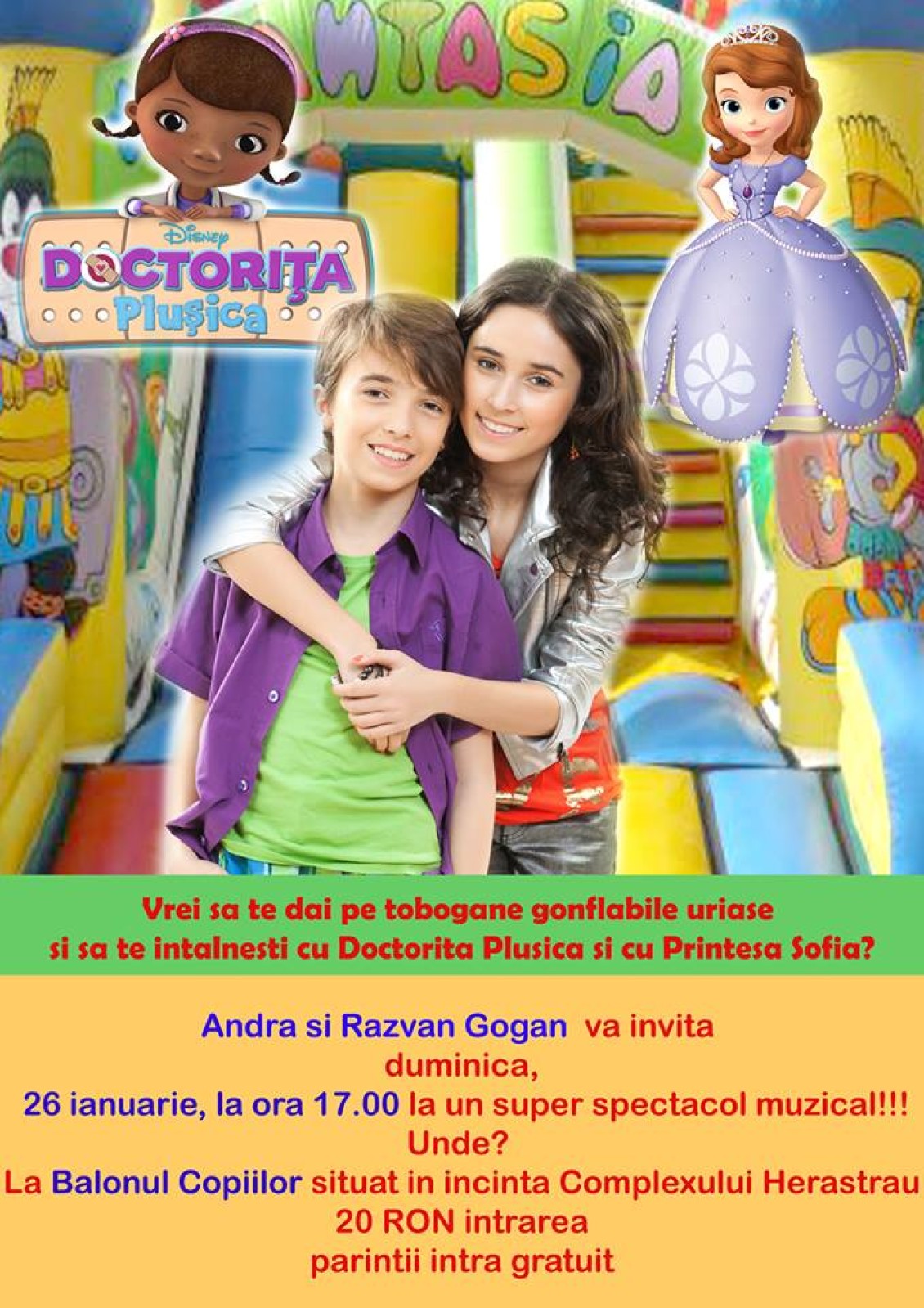 Andra Gogan este vocea Doctoritei Plusica si a Printesei Sofia, iar in timpul spectacolului ea le va infatisa pe aceste doua personaje si va canta melodiile pe care le canta in cele doua desene animate.