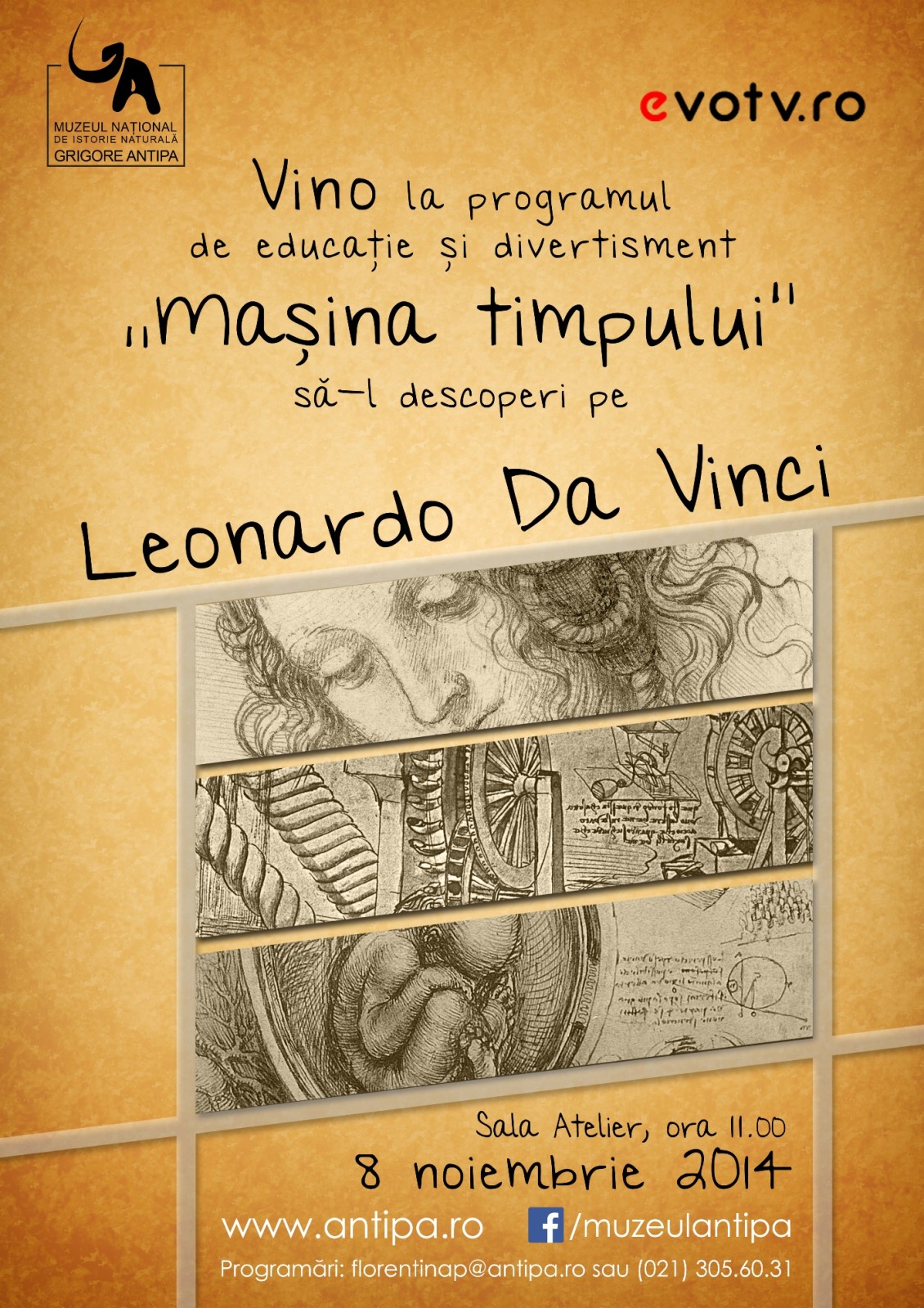 Pe 8 noiembrie, de la ora 11.00, in Sala Atelier a Muzeului „Antipa”, puteti afla mai multe lucruri despre Leonardo da Vinci, in cadrul programului Masina Timpului.