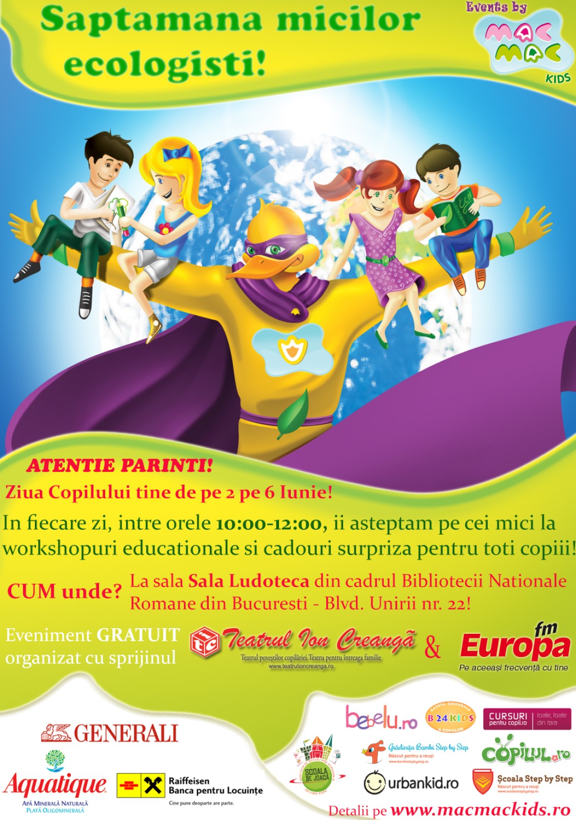 MacMacKIDS Events a pregatit, cu sprijinul Teatrului Ion Creanga, o saptamana plina de surprize educative pentru cei mici! In perioada 2-6 iunie, zilnic, intre orele 10:00-12:00, SuperMac, eroul Editurii Mac Mac, ii asteapta pe copii la “Ora de Ecologie”, in timp ce psihologul si trainerul Cati Calin va sustine workshop-uri de “Ecologie rationala”.