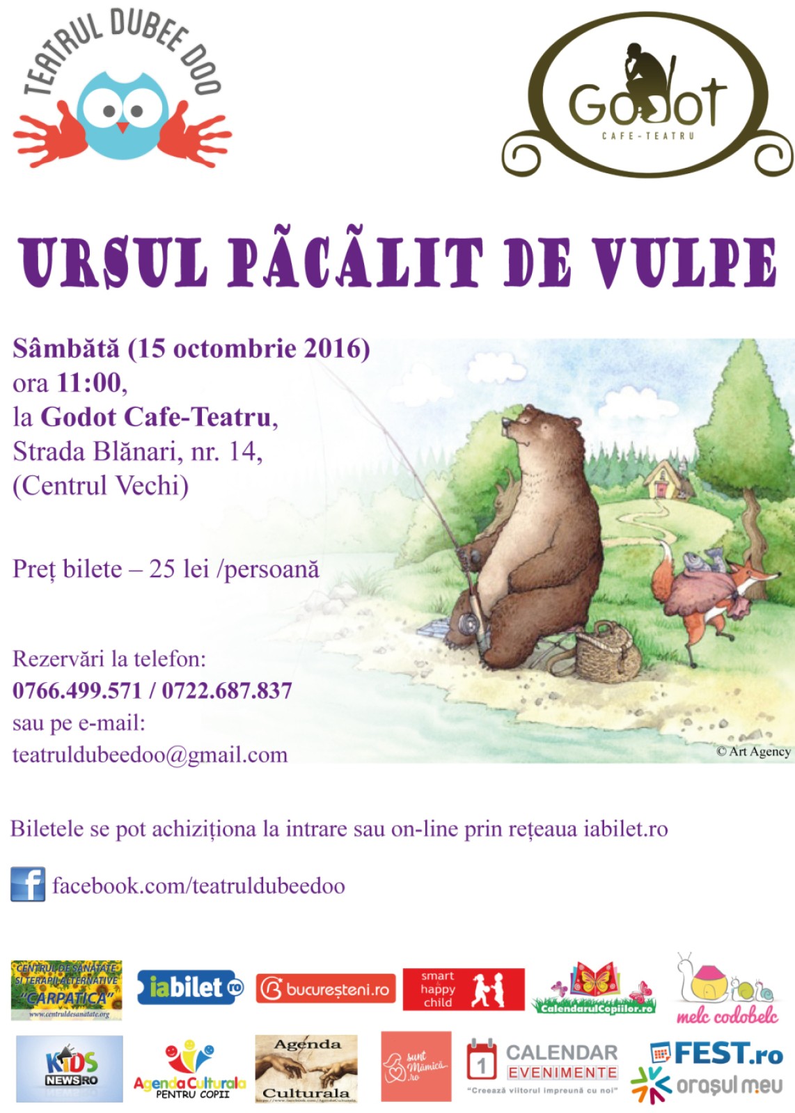 Sambata, 15 octombrie 2016, de la ora 11.00, la Godot Cafe-Teatru, str. Blanari, nr. 14 (Centrul vechi) actorii Teatrului Dubee Doo vor sustine reprezentatia piesei de teatru pentru copii “Ursul pacalit de vulpe”, adaptare dupa povestea cu acelasi titlu scrisa de Ion Creanga.
