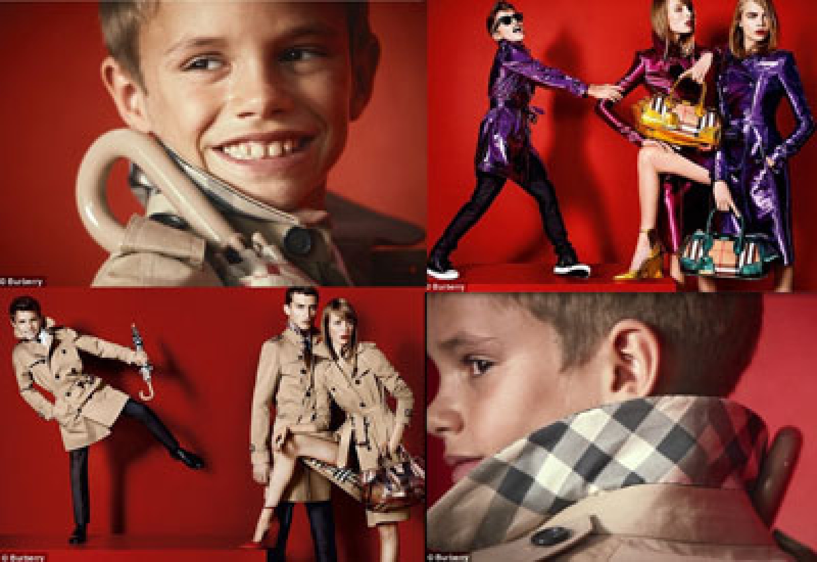 Romeo Beckham – unul dintre cei patru copii ai cuplului David si Victoria Beckham, Romeo a facut primii pasi in modeling la varsta de 10 ani, in Campania Burberry pentru primavara/vara 2013. “Romeo iubeste moda. Ii place sa iasa imbracat in costum si cu basca.., si este un mare iubitor de moda” spune mama sa, la randul sau o fashionista celebra si creatoare de moda.